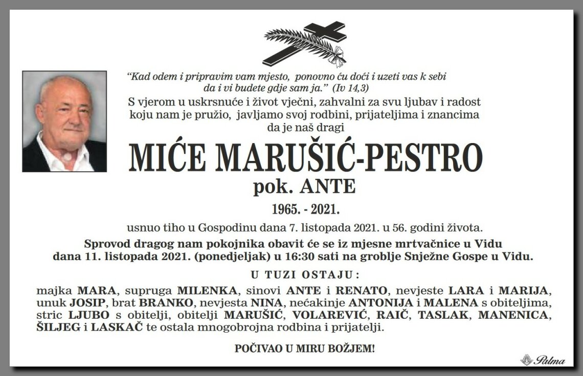 Pok. Miće (Pestro) preminuo je u 56-oj godini života. Bio je sudionik Domovinskog rata, dugogodišnji član pučkih pjevača kao i član prudskih mačkara u kojima je sudjelovao od svoje mladosti. Danas poslijepodne pokopan je na mjesnom groblju u Vidu uz pratnju Veterana 4.GBR, pripadnika hrvatske vojske te mnogobrojnih sumještana, prijatelja i poznanika-počivao u miru Božjem !!! Pok. brat Joško preminuo je prije 12 godina <<<foto sprovoda>>> |